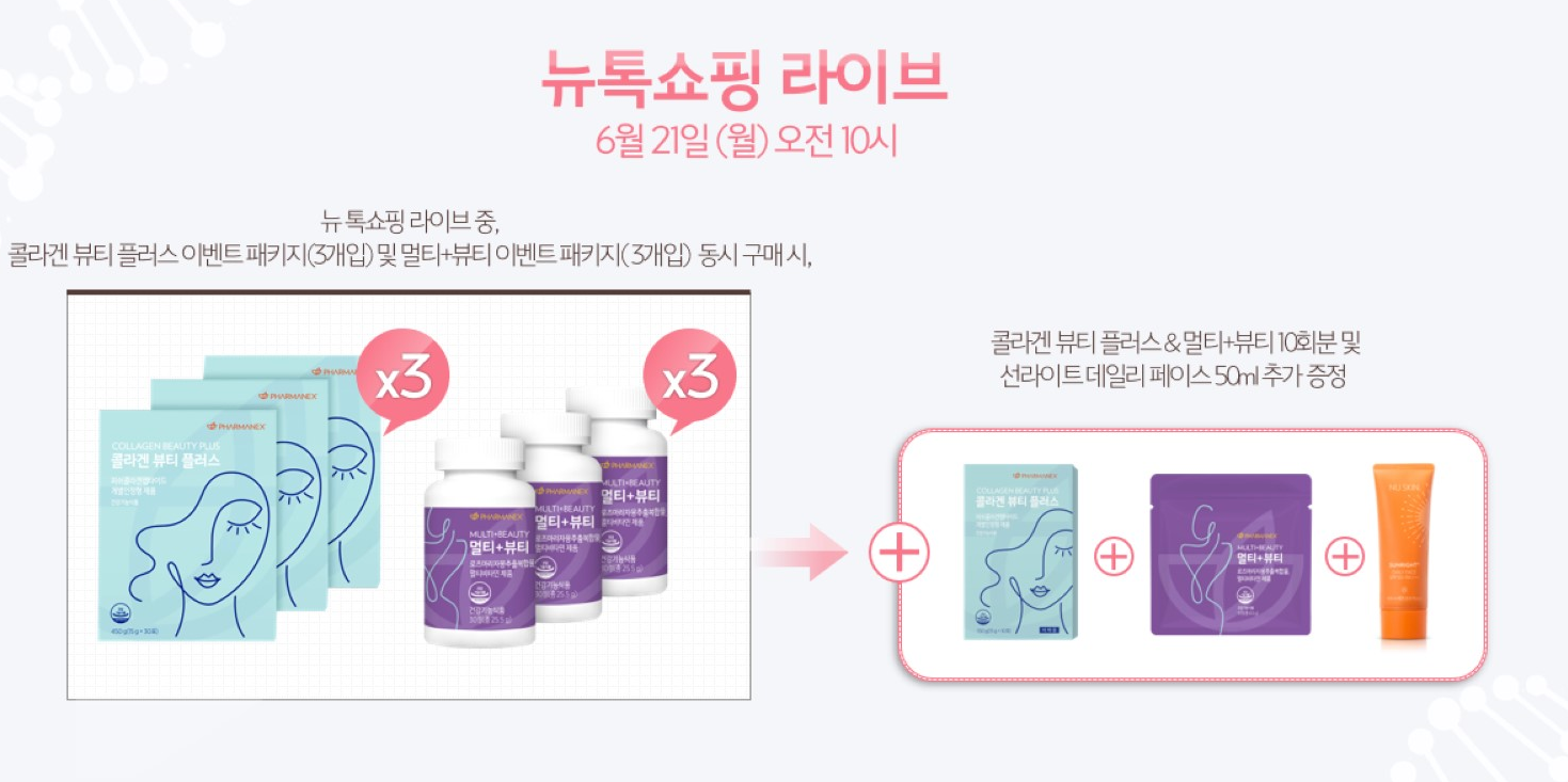 뉴톡 쇼핑 진행 중에 콜라겐 뷰티플러스 3개와 멀티+뷰티 3개를 동시에 구매하시면, 아래 구성처럼 각각 10회분은 드리고 선라이트 데일리 페이스 50ml를 추가로 드립니다!!!