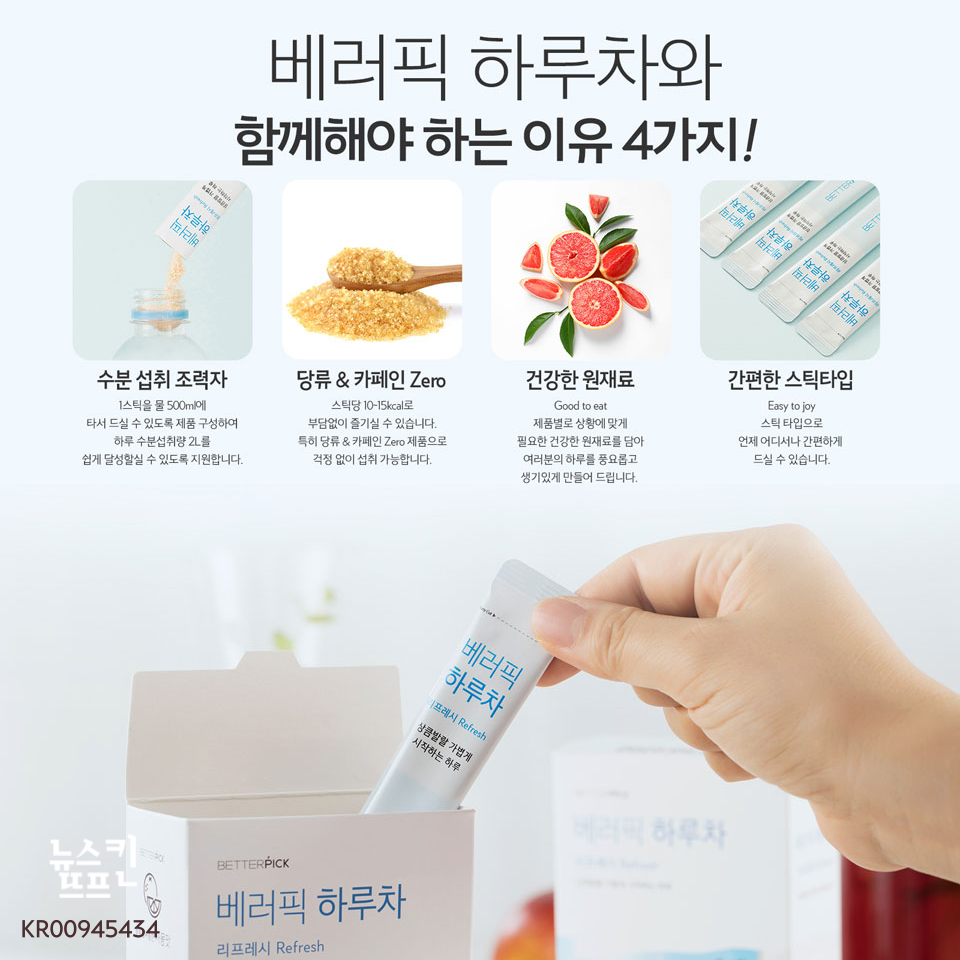 이 500ml 물에 가볍게 한 포 타서 4병만 먹어주면 하루 권장량은 거뜬히 마실 수 있는 베러픽 하루차입니다!^^